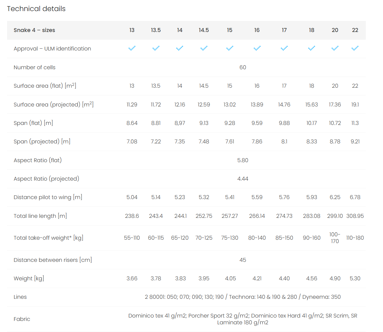 Snake 4 is a dynamic slalom wing, highly fast in turns, with exceptional resistance to collapses