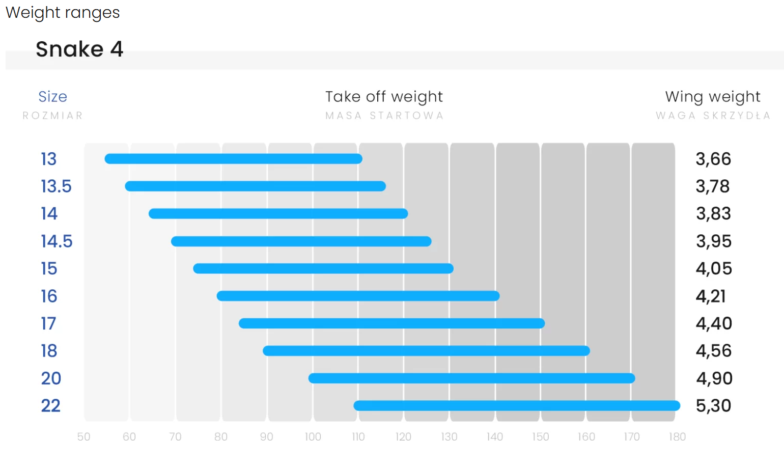 * The basic rule is to choose the wing size so the take-off weight is in the middle of the weight range. Less weight on the wing (lower range take-off weight) can be considered for foot take-off, when flying in calmer conditions, or when we want to improve economy. More experienced pilots who want to fly dynamically, have higher speed and fly in more demanding wind conditions can consider greater wing loading (take-off weight in the upper range). This is a common option among trike users.