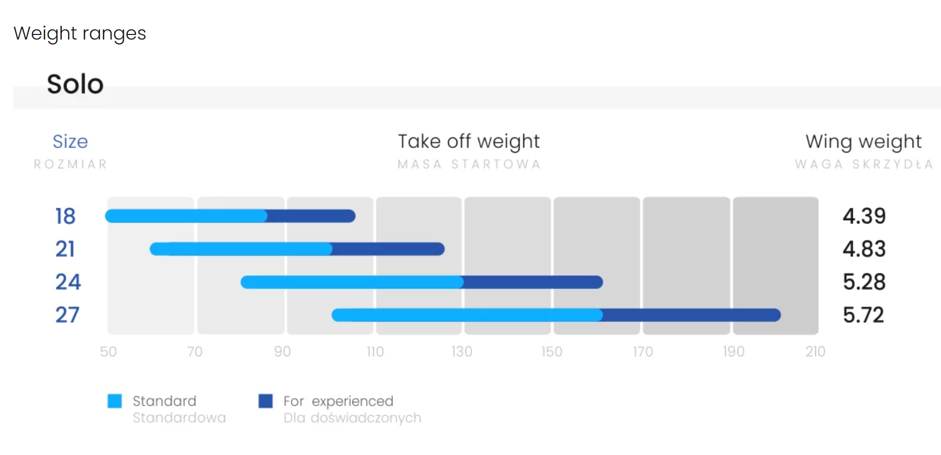 ** The basic rule is to choose the size of the wing so that the take-off weight is in the middle of the weight range. Less weight on the wing (lower range take-off weight) can be considered for foot take-off, when flying in calmer conditions, or when we want to improve economy. More experienced pilots who want to fly dynamically, have higher speed and fly in more demanding wind conditions can consider greater wing loading (take-off weight in the upper range). This is a common option among trike users.