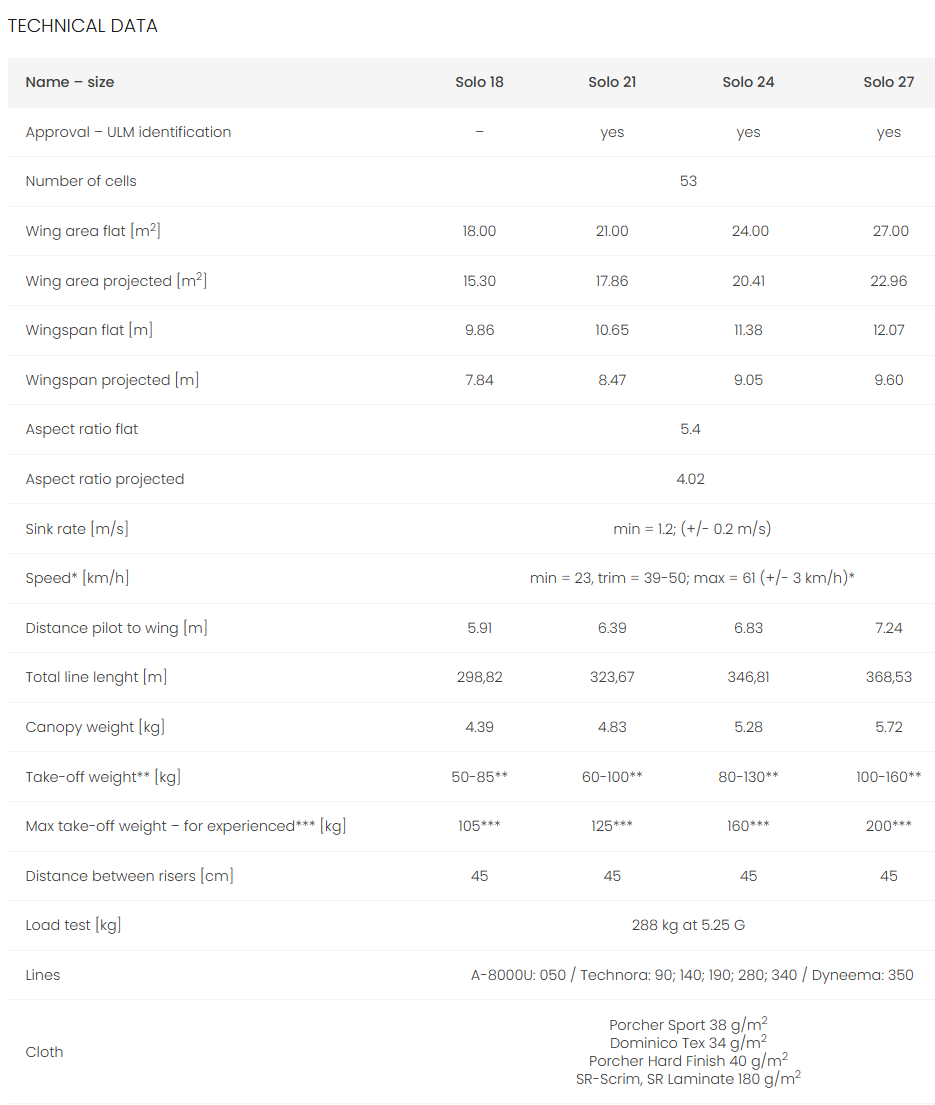 - The Solo is made with the Flexi-Egde technology – the precise shape of the leading edge is kept with laminated cloth reinforcements, incorporating synthetic rods. These rods considerably improve launch quality, as well as keep deformations away at high speeds.